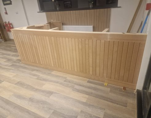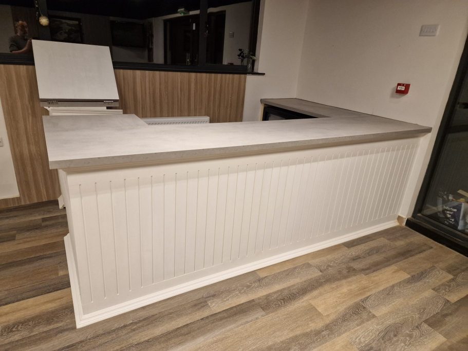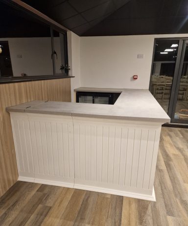 Here we have pictures of a lovely Custom-made Bar for the Lakeside Café at Wylands Farm in Battle, the owners and the manager commissioned MGR to design and build this 10ft x 5ft U-shaped Bar with access point ,under counter shelf and storage area for their upstairs event/entertainment area where they will hold parties & special occasions like wedding receptions etc, we are really proud of the finished result and hope everyone gets lots of use from it in years to come as well as creating some life long memories of their special days.