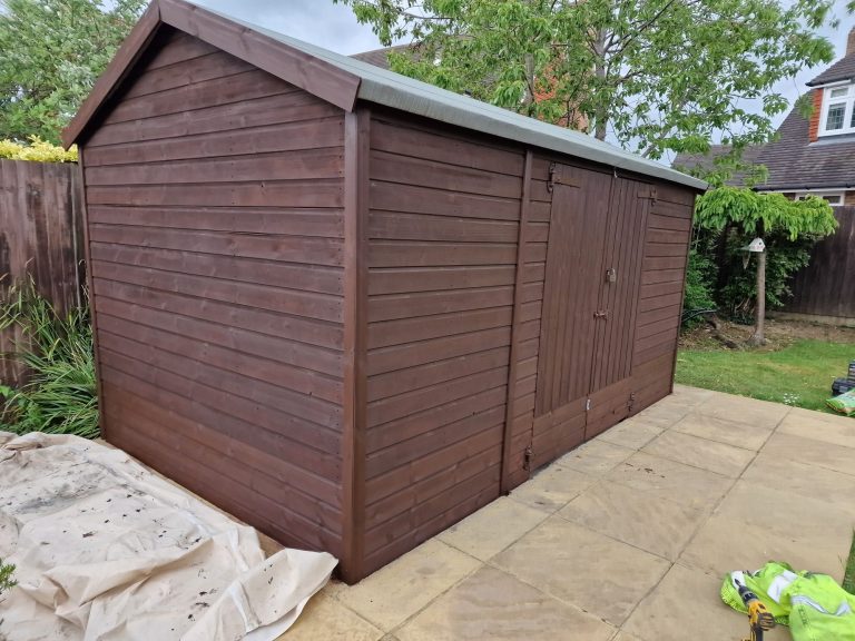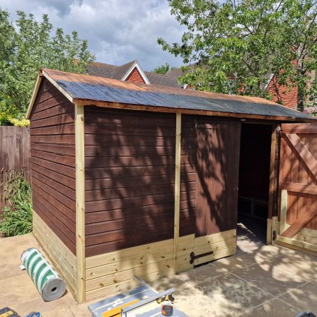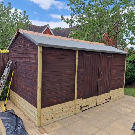 As you can see there was extensive work required including restructuring 18 inches of the base of the building, repairing the doors, re-felting & retrimming the roof and body of the building, including adding some diagonal bracing inside to stop the building from racking and then finally giving it a nice fresh coat of protection.