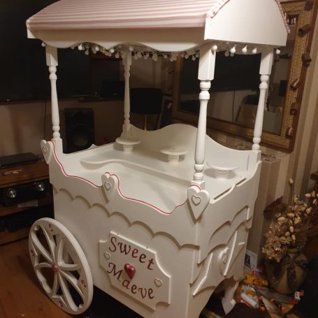 This was a custom built Sweetie Cart for a customers daughters christening once MGR had designed and built it we showed the customer who absolutely loved it.